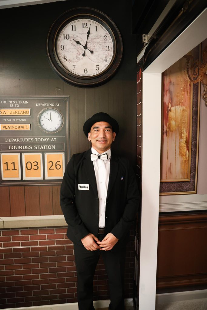 Created to resemble a fine-dining rail carriage, the St Vincent Express, departs from Lourdes Station which transformed an existing library space into a beautifully themed train setting where residents can sit back, relax, and enjoy afternoon tea while travelling the world through immersive virtual reality.